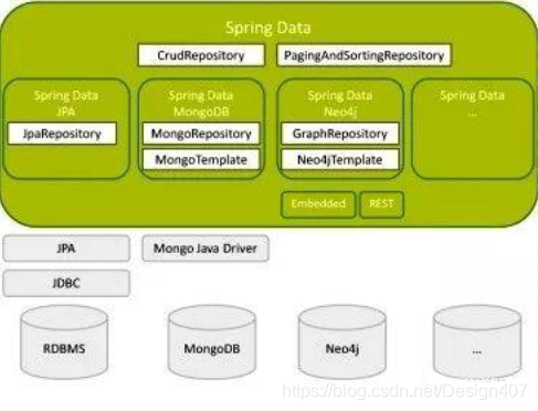 Spring Data 是为了简化构建基于 Spring 框架应用的数据访问技术,包括关系数据库、NoSQL、Map-Reduce 框架、云数据服务等等,旨在提供一种通用、统一的编码模式(但是并不是代码完全一样),使得在Spring中使用任何数据库都变得非常容易。